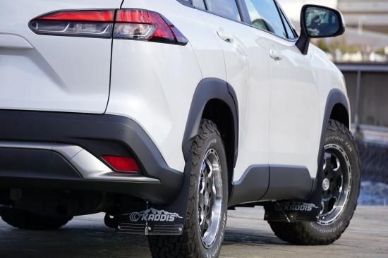 カローラクロス専用マッドフラップ カローラクロス専用にカット・穴あけされているので マッドフラップのカットや穴あけなど 一切の加工は必要ありません。 マッドフラップをハンガーキットで 固定するとフラップに隙間が出来ますが それを無くすようハンガーキットは 表裏の挟み込みタイプです。 ●材質: マッドフラップ:EVA材3mm厚 ハンガーキット:ステンレス ●商品構成 マッドフラップ4枚(1台分) ※カラーはブラック/ロゴはシルバー ●取付情報 取付けはボルトオンタイプ